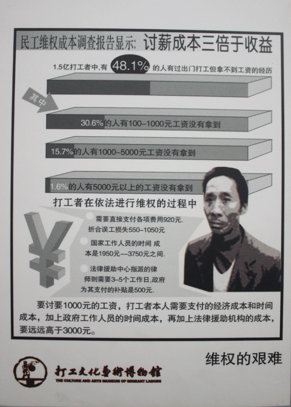 “从劳动监察、劳动仲裁到诉讼,农民工要付出巨大的经济成本、时间成本,还有政府成本和法律援助成本。一般情况下,讨薪1000元需要付出综合成本至少3000元。这还是保守的计算。根据我们对17个案例的调查情况来看,每个案例的维权综合成本都超过1万元。根据全国总工会不完全统计,到2004年11月中旬,全国进城务工的农民工被拖欠的工资约有1000亿元。根据我们的结论,为了索要农民工的1000亿欠薪,整个社会至少要付出3000亿的成本。”